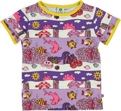 All our T-shirts for children are made off 100% organic cotton for the benefit of both your child and the environment. Our T-shirts have different prints such as landscapes, firetrucks or rabbits. When children learn to talk, it can be funny to turn dressing into a game, where the children can put words on the motives, prints and colors there is on our different designs. That way the children develop the imagination and story telling skills, at the same time they are getting dressed.