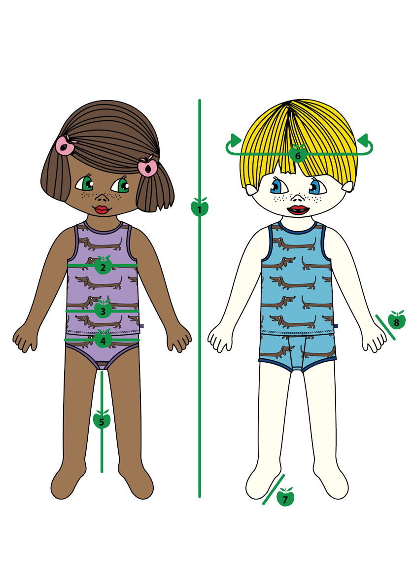 Measure your child without clothes or with a slim undershirt and underwear. Find the measurements in table below and read the best fitting size. All clothing is added extra width for movement.