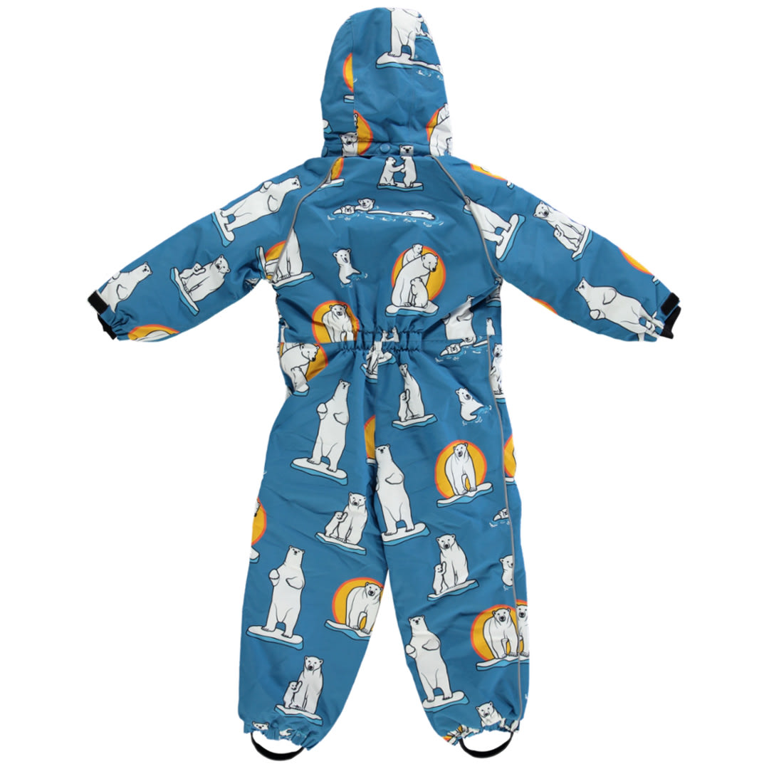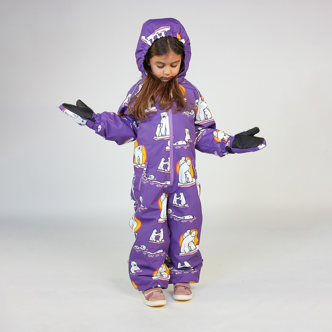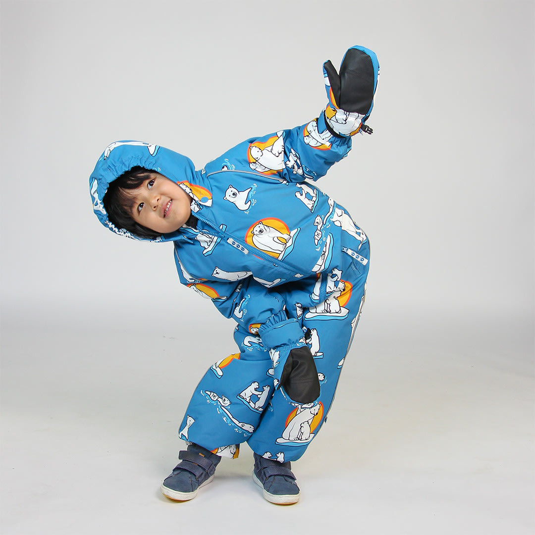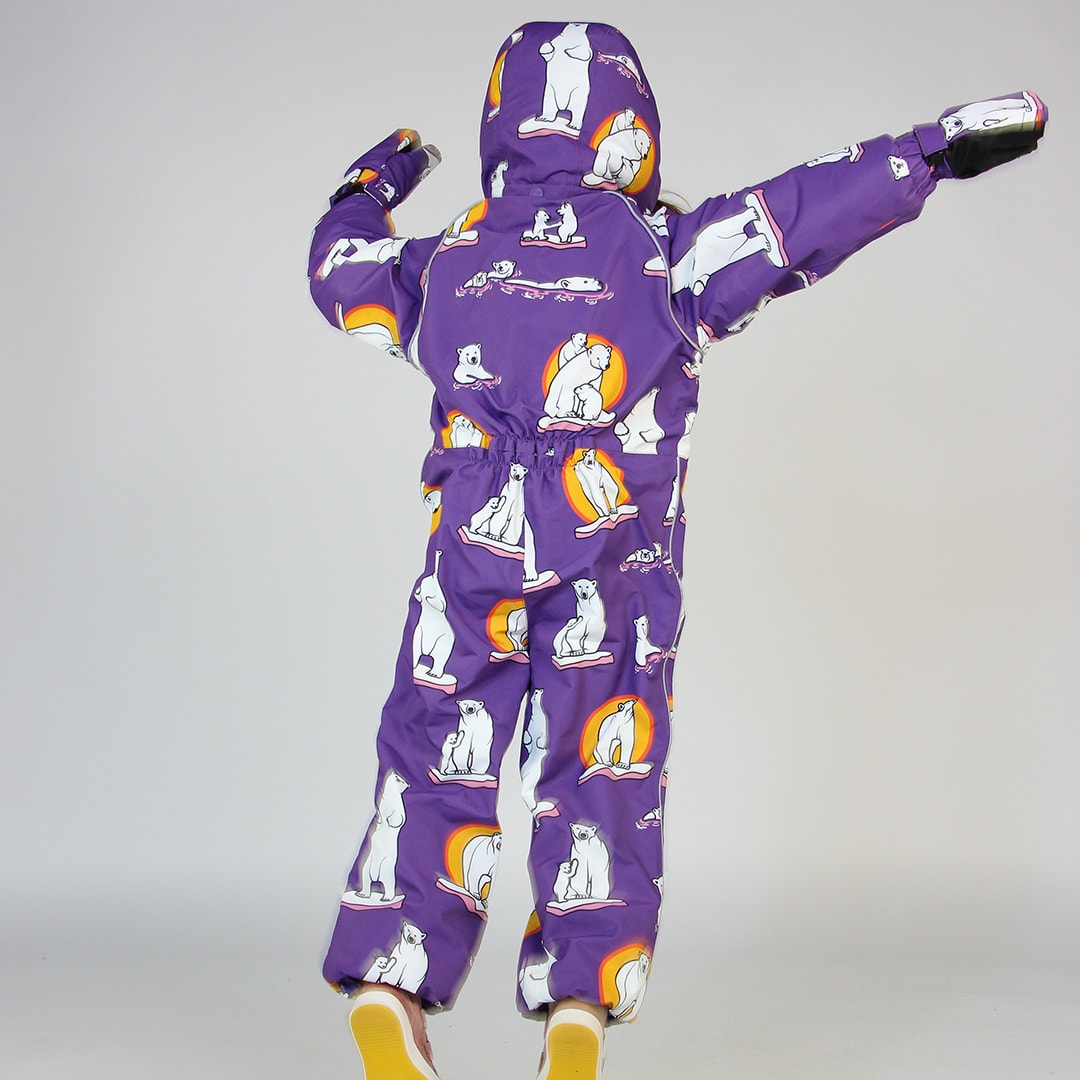 Snowsuit for junior with polar bears from size 4-5 to 11-12 years. This snowsuit has a front zipper and a removable teddy fleece hood. The suit has windbreak in the sleeve, and the wrist can be adjusted with a velcro closure. The suit has elastic in the back for a better fit. In addition, the snowsuit has braces, so that it is possible to take off the upper part without the lower part falling down.