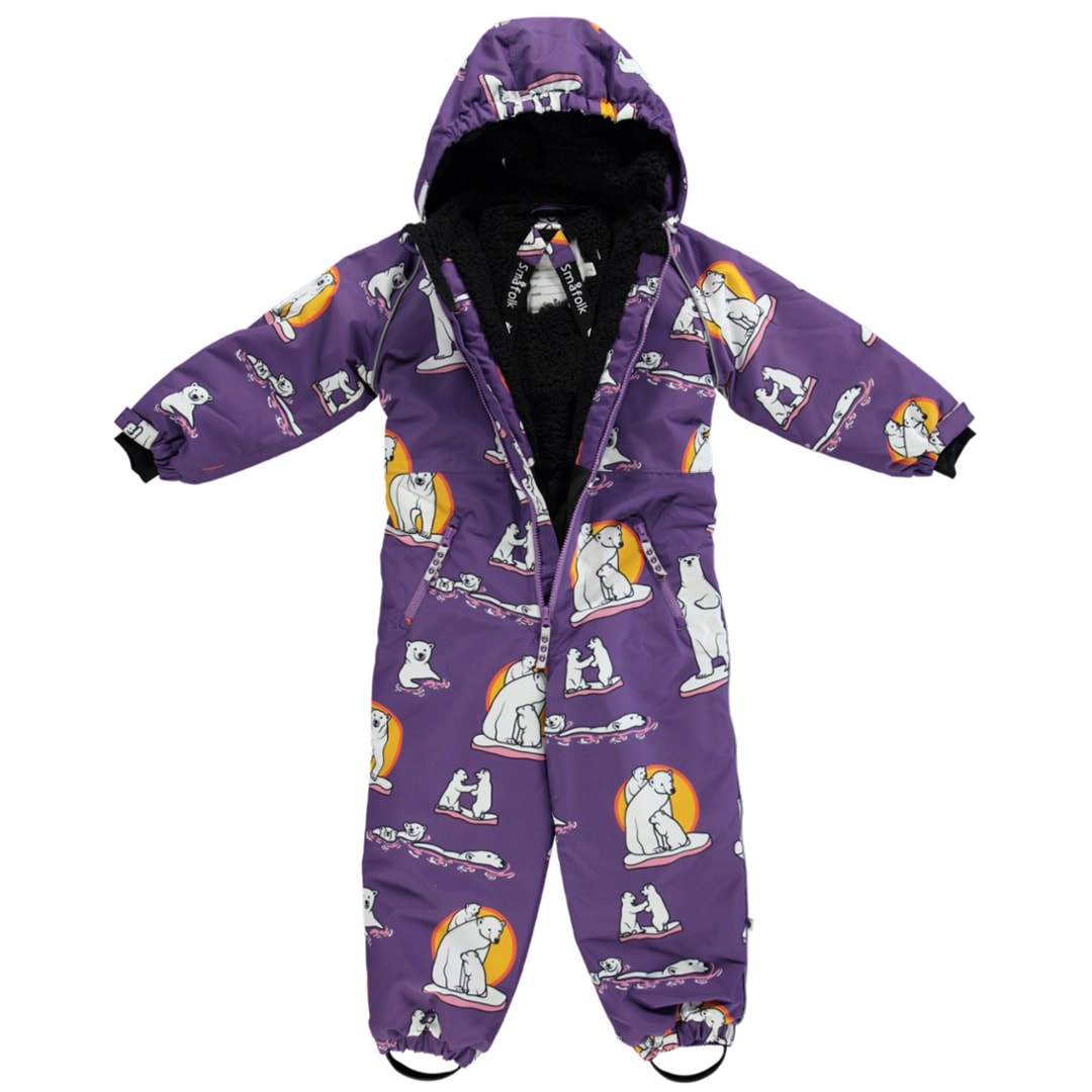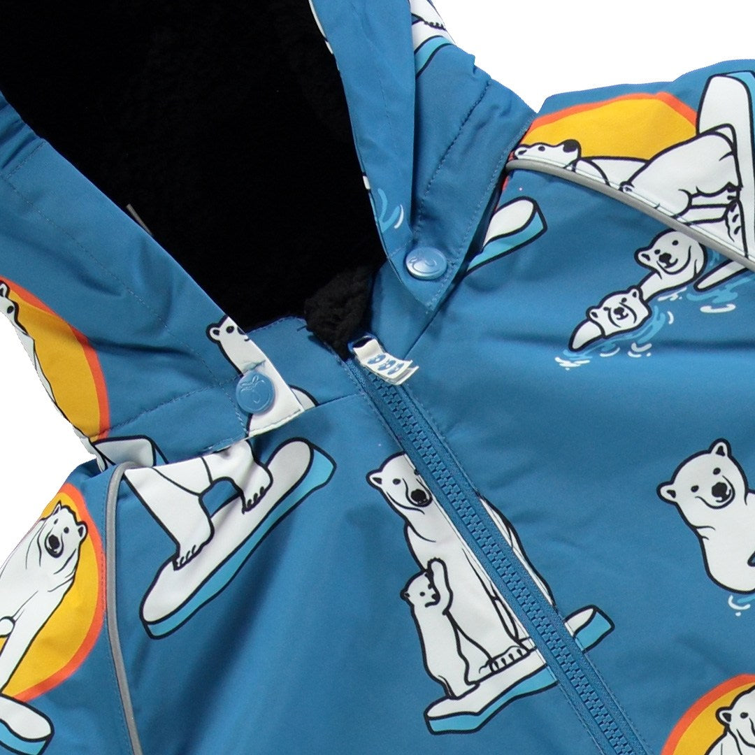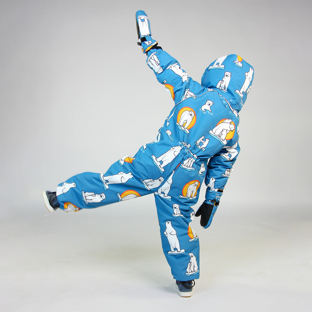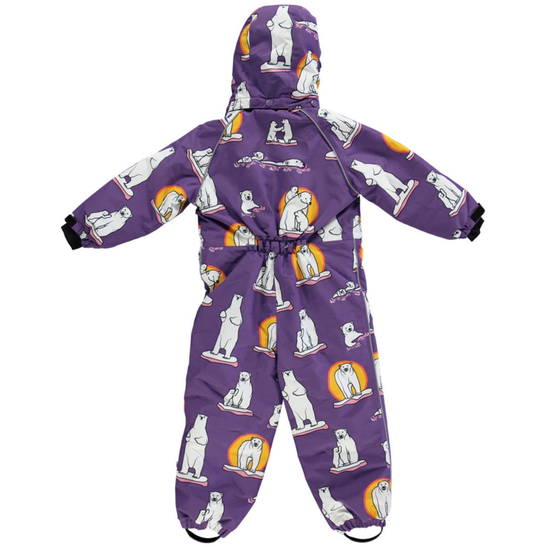 Snowsuit for junior with polar bears from size 4-5 to 11-12 years. This snowsuit has a front zipper and a removable teddy fleece hood. The suit has windbreak in the sleeve, and the wrist can be adjusted with a velcro closure. The suit has elastic in the back for a better fit. In addition, the snowsuit has braces, so that it is possible to take off the upper part without the lower part falling down.