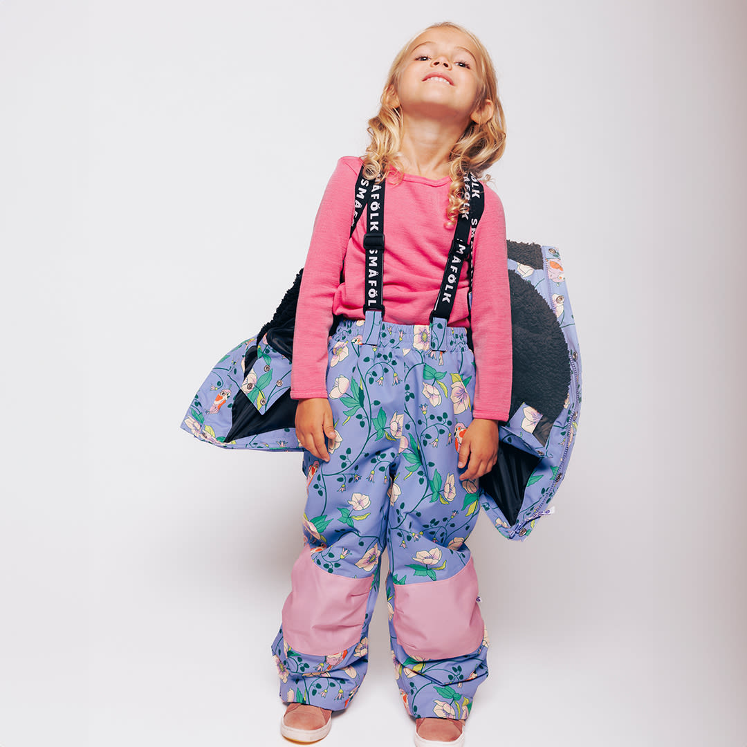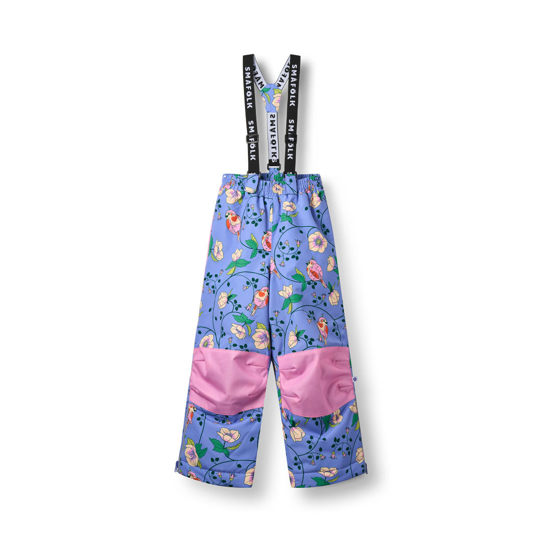 Children's ski pants with birds and flowers. The ski pants have removable elastic braces and adjustable openings at bottom of the legs with zippers and reflective piping to make the pants fit over a ski boot or winter boots easily.