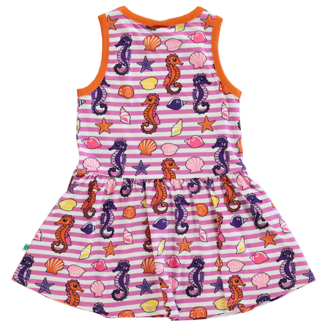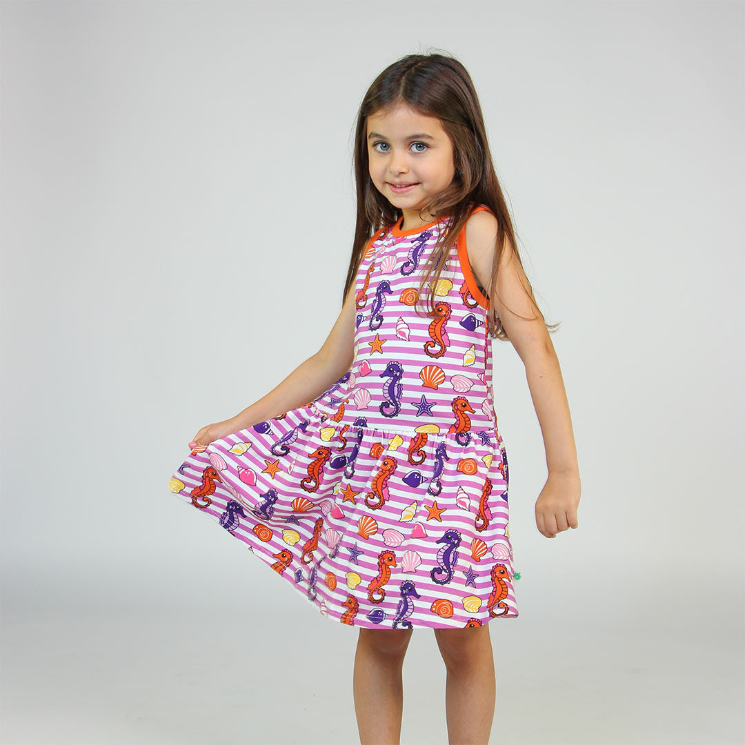 Sleeveless dress with seahorses, produced in an organic and stretchable cotton jersey. This dress is OEKO-TEX Standard 100® certified, which means that the dress has been produced and tested for harmful substances, so you can take care of your child's skin and health.
