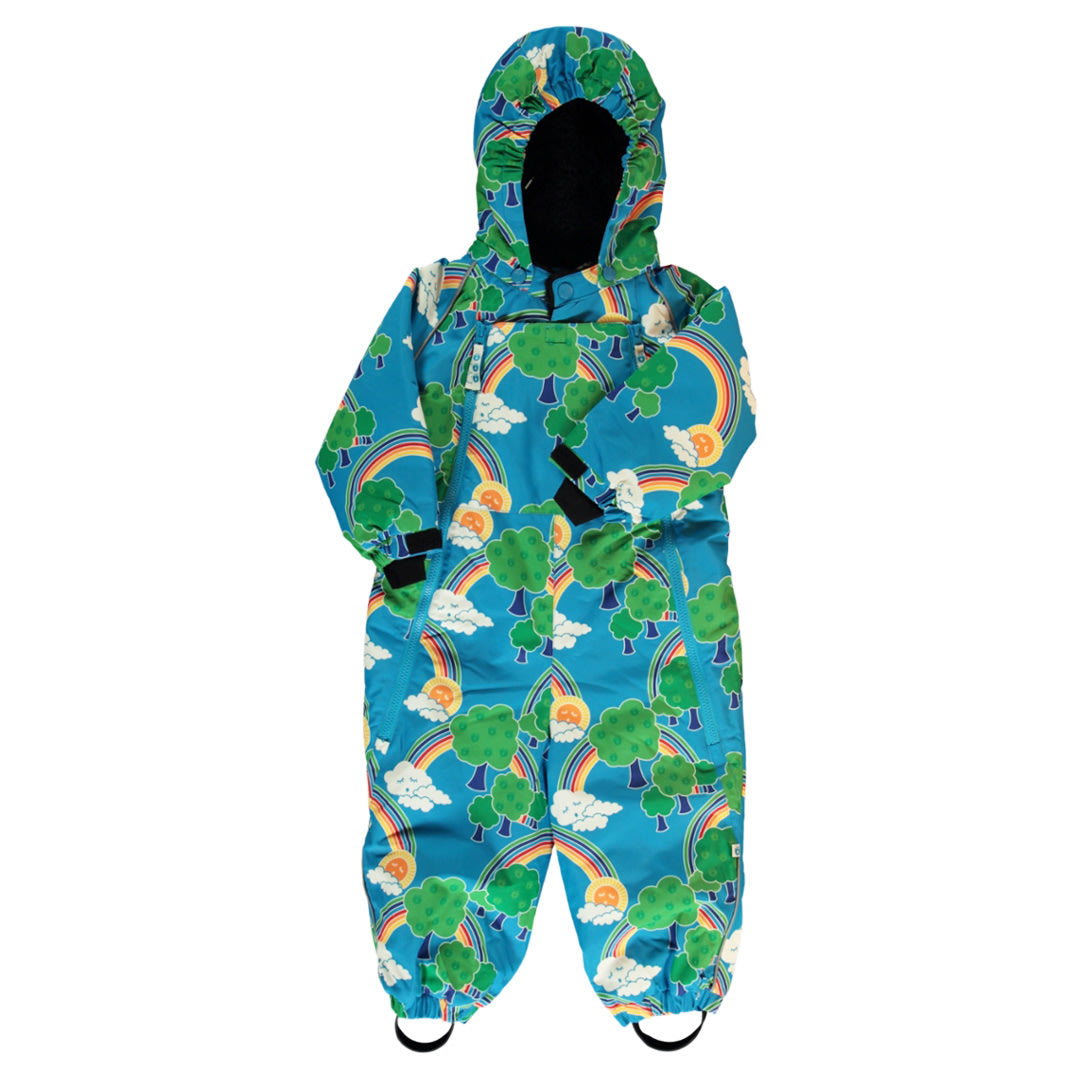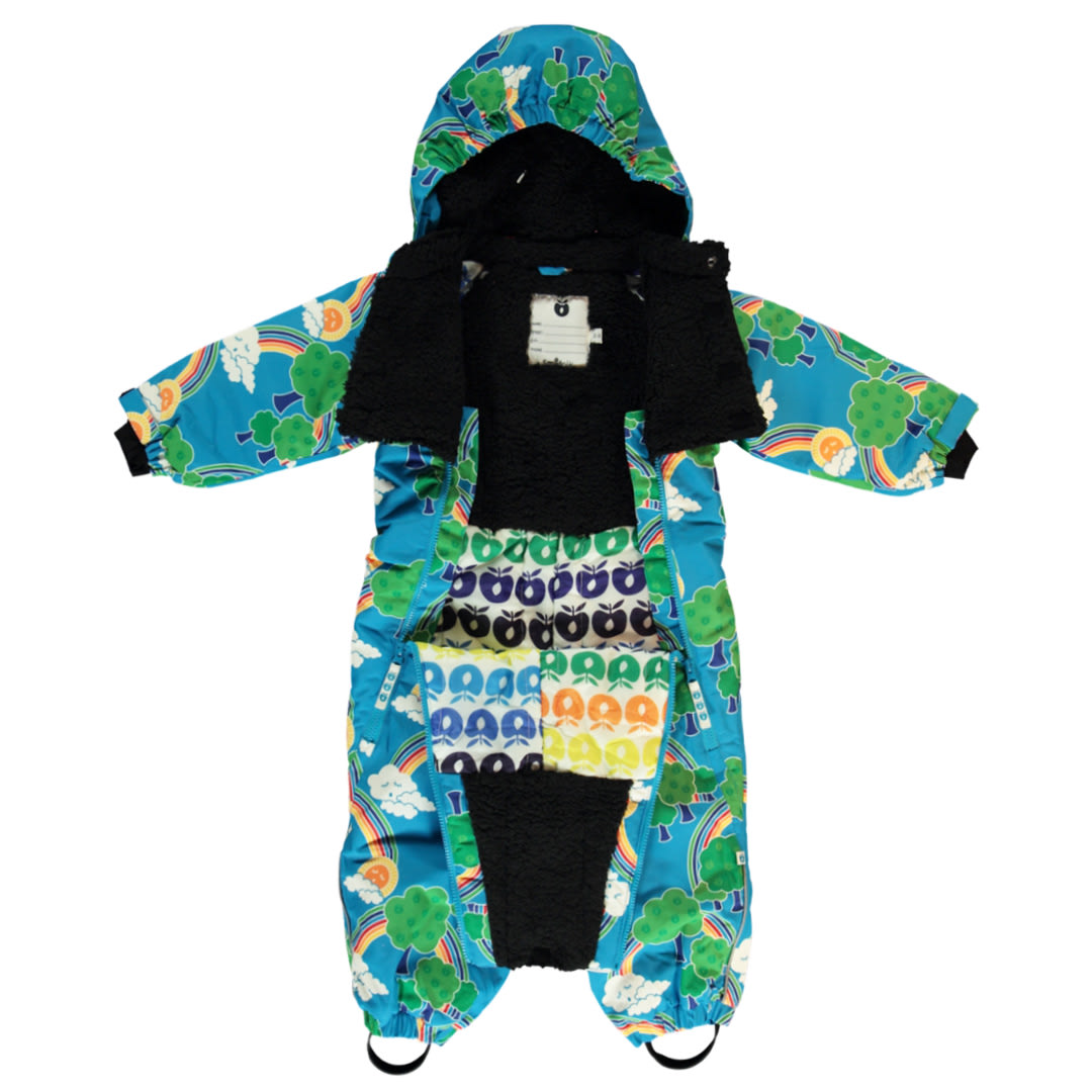 Snowsuit for toddlers with rainbows from size 6-12 months to 3-4 years. This jumpsuit has two zips at the front that go far down the legs, as well as a velcro closure at the front that ensures that the child is well protected around the body and neck. The suit has velcro closures at the wrists so that the sleeves can easily fit into some gloves, as well as a removable hood with teddy fleece. The suit has elastic in the back for a better fit. The snowsuit has removable rubber straps at the feet and there is reflective piping on the front and back at the arms and at the bottom of the pant legs.