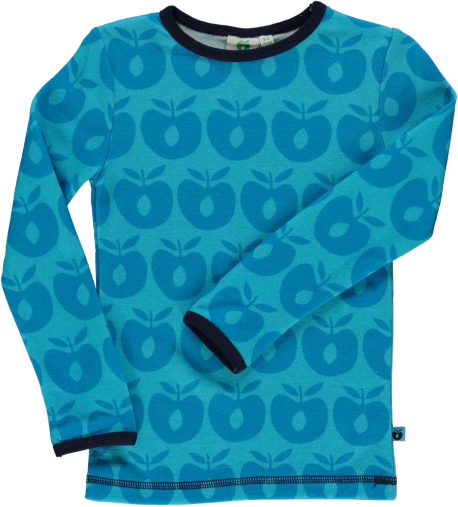Long-sleeved blouse in wool and bamboo blend with apples. Wool and bamboo are fantastic natural materials, and bamboo is also sustainable. Wool has the ability to help the body regulate temperature. Wool insulates against the cold and keeps the body warm, even when the body gets damp. Wool can be used all year round, day and night, we recommend wool in all the months that R is in.
